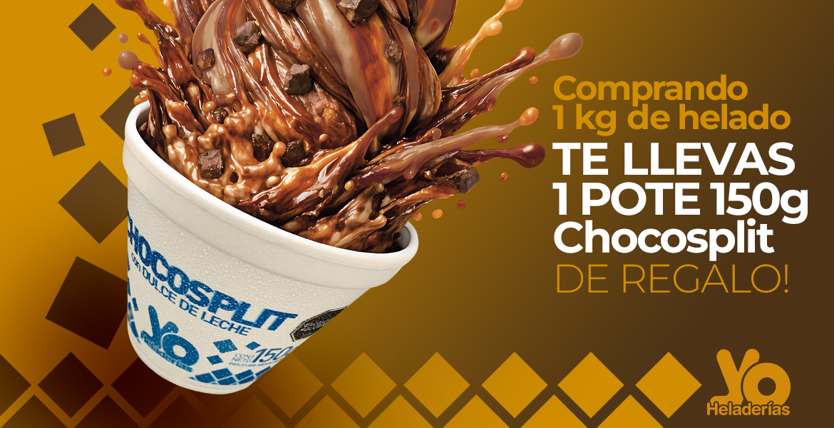 Con la compra de 1 kg. de helado TE REGALAMOS 1 POTE DE 150G CHOCOSPLIT; delicioso helado de Chocolate con un toque de Dulce de leche.